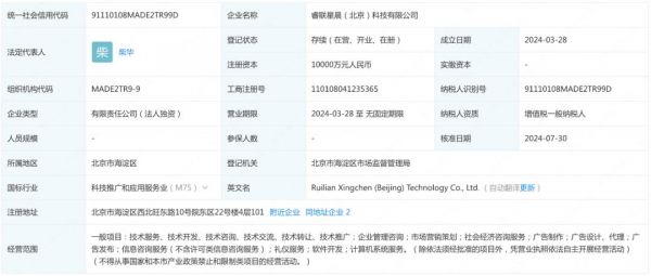 睿联星晨为滴滴旗下智能座舱相关资产。企查查数据显示,睿联星晨成立于2024年3月28日,是一家以从事科技推广和应用服务业为主的企业;7月30日,睿联星晨注册资本从100万元变更为1亿元。