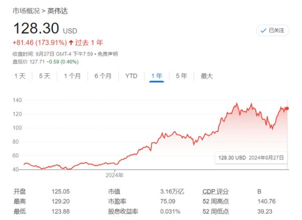 今年至今英伟达飙升逾170%,市值维持在3万亿美元出头,而标普500指数的平均成分股只有990亿美元。不过,Koyfin数据显示,该股在6月创下135美元左右的高峰后,似乎有些停滞不前。