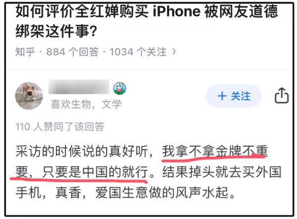 这位博主在某乎上作用不少粉丝,算是一位人气博主,她在“如何评价全红婵购买iphone被网友道德绑架这件事”里吐槽全红婵:采访的时候说的真好听,我拿不拿金牌不重要,只要是中国的就行,结果掉头就去买外国手机,“爱国生意”做得风生水起。