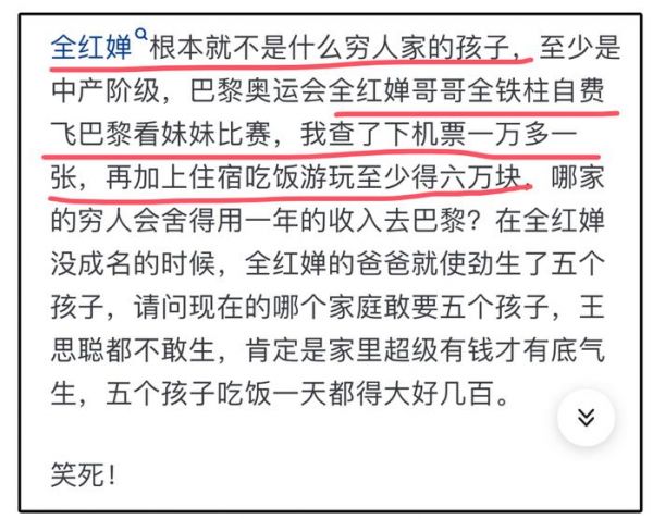 博主甚至认为全红婵家之所以敢要5个孩子,“肯定是家里超级有钱才有底气生”,因为“五个孩子一天吃饭都得大好几百”,实在令人啼笑皆非。
