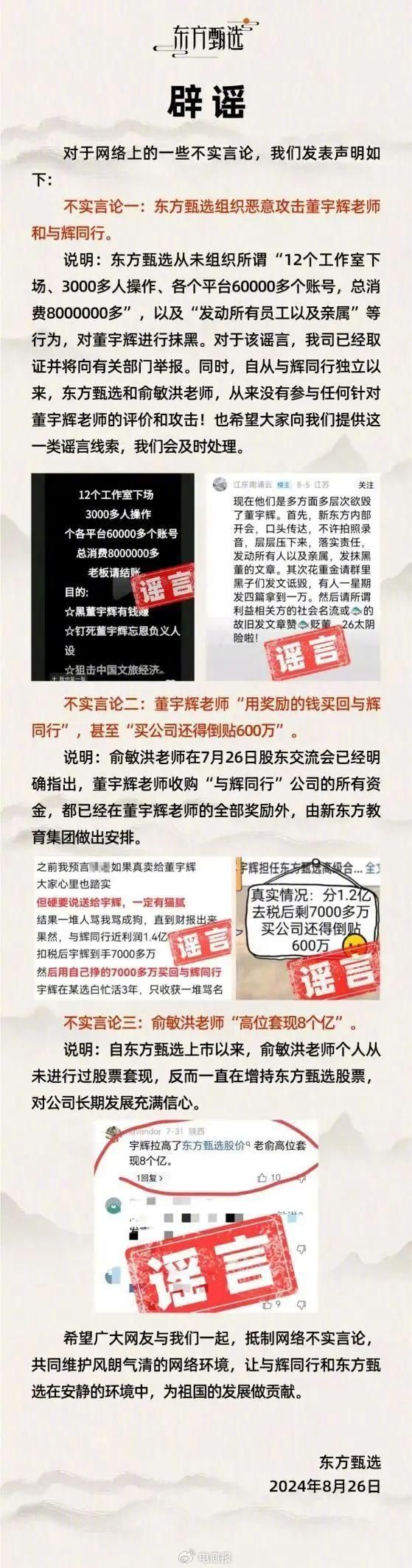8月26日,东方甄选发表声明,重点澄清三大谣言:一,组织大规模抹黑董宇辉的虚假行为并不存在,已取证举报;二,董宇辉收购“与辉同行”资金非仅个人奖励,含新东方教育集团支持;三,“俞敏洪套现8亿”是不实言论,强调其一直增持公司股票,对东方甄选的未来抱有坚定的信心。
