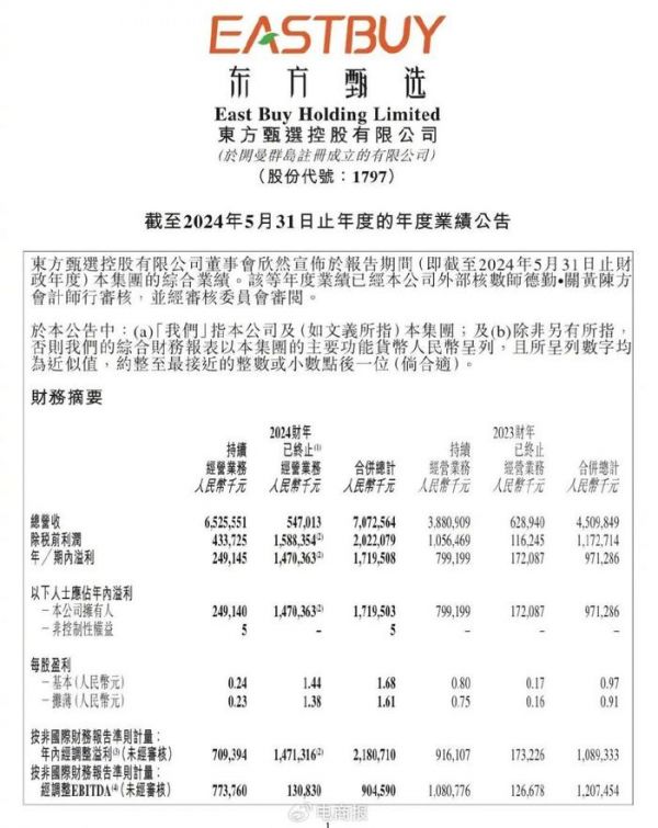 根据东方甄选最新发布的2024财年年报显示,截至2024年5月31日止年度,东方甄选实现总营收70.72亿元,同比增长56.8%;净利润为22亿元,同比去年的11亿元实现翻倍增长。