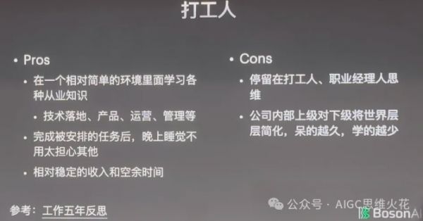 在大公司工作需要确保个人目标与公司一致,而非仅追求个人兴趣。创业公司面临生存压力,需要更高的驱动力。打工人虽有稳定收入和学习机会,但可能限制思维。