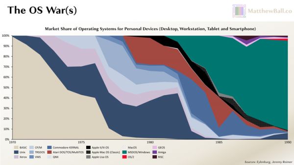 1989年,MS-DOS的市场份额已经接近90%。