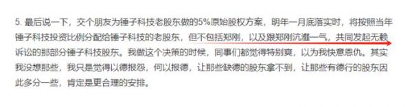 另外,在公开文章中,罗永浩还不忘再给郑刚一暴击,称新公司的股份不会分给郑刚。