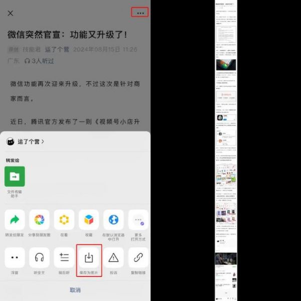 在微信文章页面点击右上角“···”打开功能面板后,里面新增一个“保存为图片”的功能。