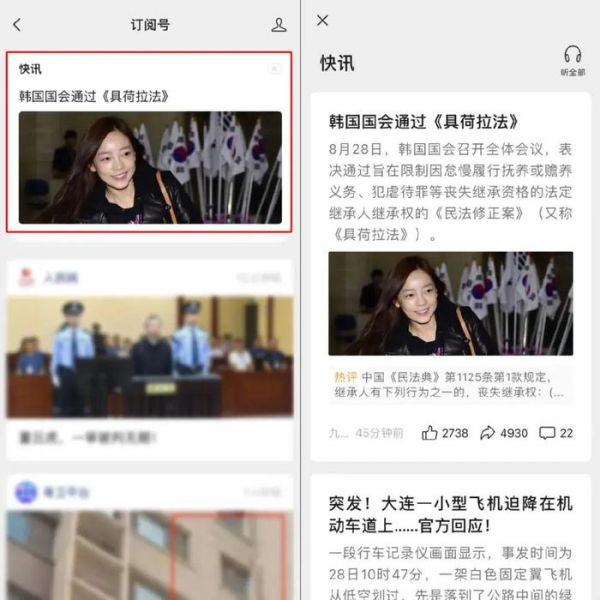 在订阅号信息页随机出现了一个名为“快讯”的新版块,里面聚合了实时的热点新闻,内容形式包括文章和视频。