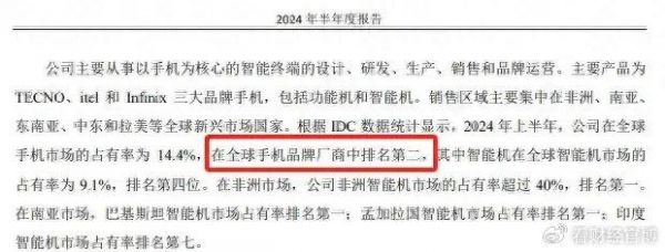 日前,上市公司传音控股披露了2024年半年报。报告显示,据IDC数据,2024年上半年,传音公司在全球手机市场的占有率为14.4%,在全球手机品牌厂商中排名第二,其中智能机在全球智能机市场的占有率为9.1%,排名第四位。