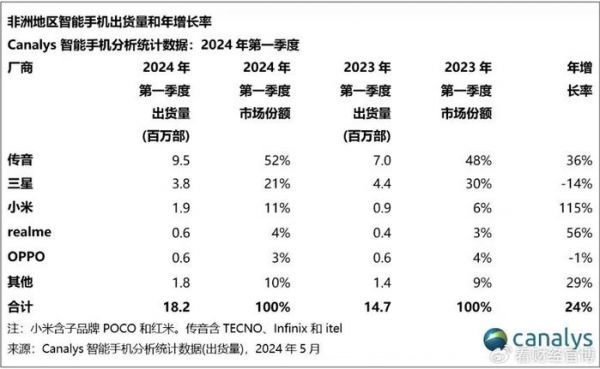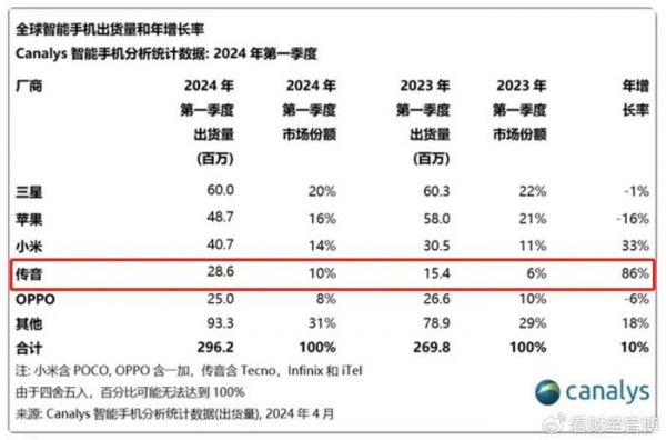 据分析机构Canalys,2024年第一季度全球智能手机市场同比增长10%,而同期传音智能手机却实现了86%的强劲增长。