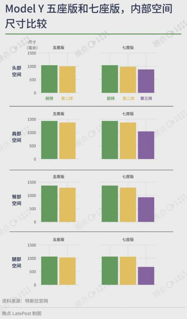 其车内第二排是有 3 个可向前折叠、前后滑动的座椅,方便调整,让人进入第三排的两个座位。但第三排空间略显局促,腿部空间比 5 座版的 Model Y 第二排少了 4 厘米。