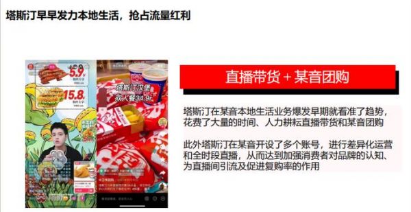 数据来源:增长黑盒/久谦平台《下沉市场新商机》例如这几年扩张很快的中式汉堡品牌塔斯汀,就充分抓住了抖音直播带货和抖音团购的红利,他们花费了大量的时间、人力经营抖音直播带货和团购市场,同时在抖音开设了多个账号进行差异化运营和全时段的直播,从而达到了加强消费者对品牌的认知、为直播间引流及促进复购率的作用。