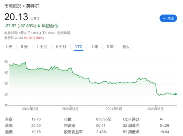 过去一年,英特尔的每股收入和每股收益分别暴跌了34%和54%,公司股价暴跌至2013年以来的最低水平,今年以来下跌了近58%。