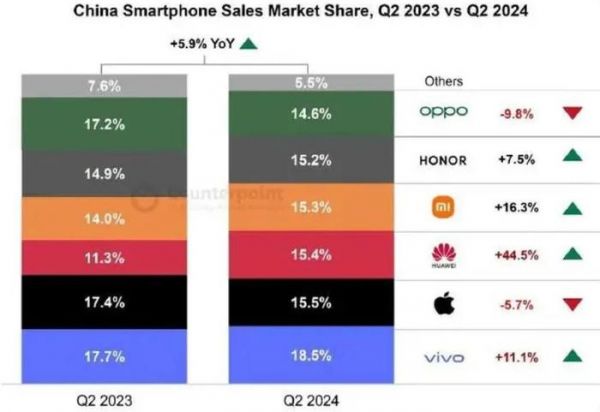 在2024年第二季度里,苹果的出货量仅为950万台,同比降低3.1%,市场份额降至13.8%,在市场份额上首次跌出中国市场前五。而在新兴市场中,iOS设备因为价格高昂等原因,增长速度也远不如安卓设备,在失去两个主要增长市场的支撑后,iOS设备的增速自然远不如预期。