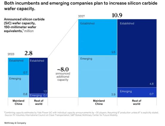 过去几年,人们对电动汽车的热情如此高涨,以至于新的和现有的SiC晶圆供应商纷纷宣布,他们计划将150毫米SiC晶圆当量的产能从2023年的280万片提高到2027年的1090万片,增幅超过三倍。