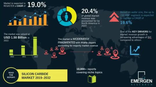 根据Emergen Research预测,在2023~2032年碳化硅市场将保持约11.6%的年均增长率。到2032年,市场规模预测将达到91.8亿美元。