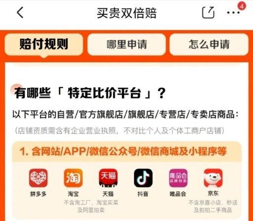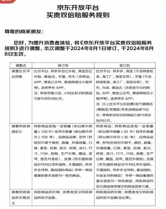 除此之外,本月初,京东还更新《京东开放平台买贵双倍赔服务规则》,扩大比价范围。按照新版规则,POP商家的比价范围不再局限于拼多多百亿补贴和淘宝百亿补贴,而是变成了拼多多、淘宝 & 天猫(不含阿里拍卖、淘工厂、淘宝买菜)、抖音、唯品会等等更多平台和渠道。