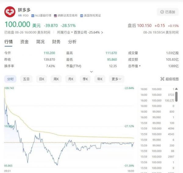 这些言论直接导致拼多多股价暴跌,截至8月26日收盘跌去28.5%,一夜之间蒸发了554亿美元(约合人民币4000亿元)。