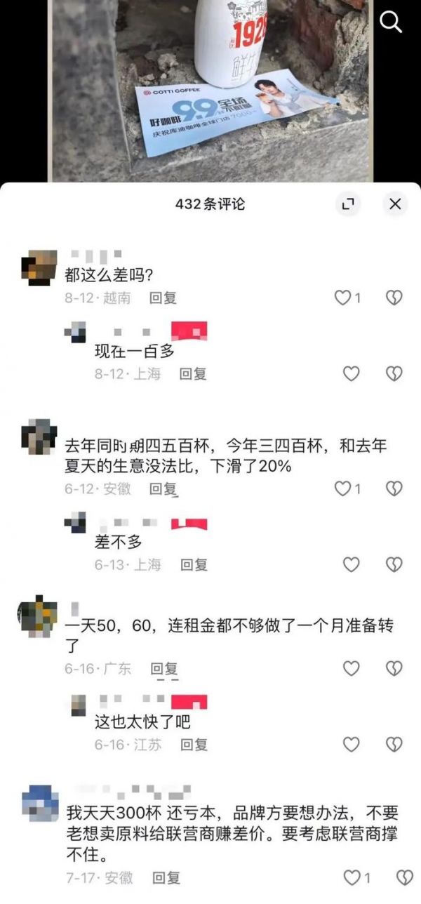 此番言论迅速引发了不少库迪联营商的共鸣,纷纷在评论区吐槽“一天50、60,连租金都不够,做了一个月准备转了”“天天300杯,还亏本”“和去年夏天的生意没法比,下滑了20%”……