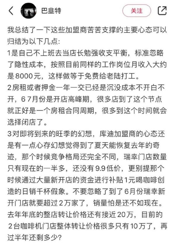 回本遥遥无期,旺季下滑的杯量成为压倒这些库迪联营商的最后一根稻草,毕竟连旺季的经营情况都不容乐观,更何况即将到来的漫长淡季,就好比如果刮奖的时候刮出一个“谢”字,大部分人都不会想继续再刮下去了。