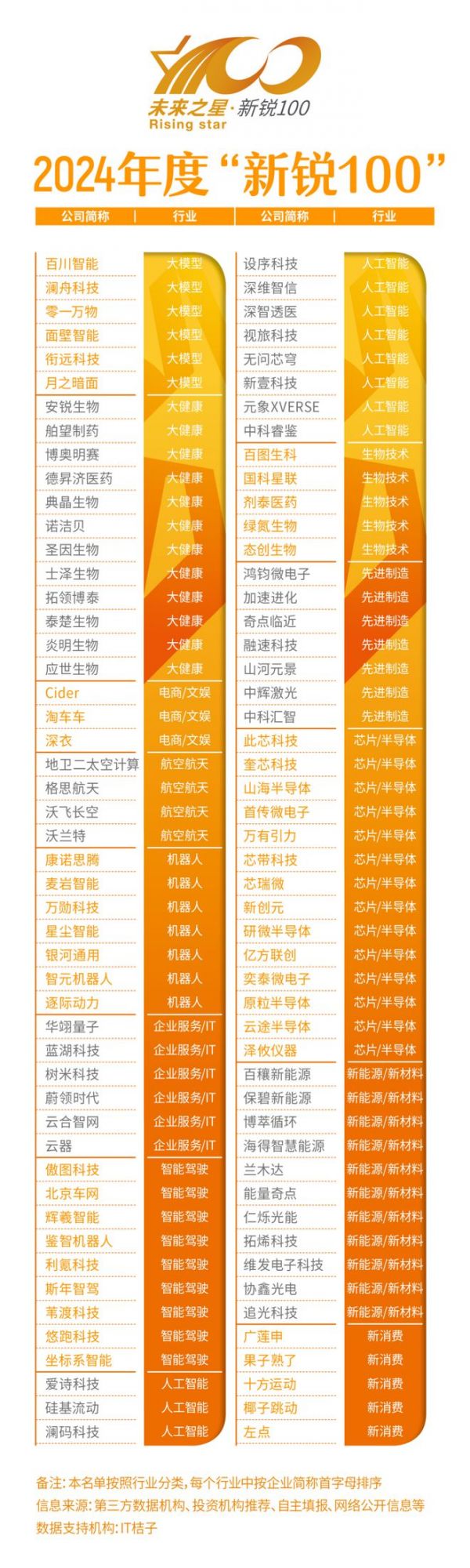 今年,我们将视野聚焦在成立不超过5年,估值在5亿元人民币以上或融资轮次在天使轮及以上的初创型公司,希望找到其中最有潜力成长壮大的“种子”公司。通过网络征集、投资机构及专业组推荐、第三方数据公司、其他公开渠道收集等方式,以公司估值、融资轮次、营业收入等客观数据为主要依据,最终确定了100家年度新锐公司。