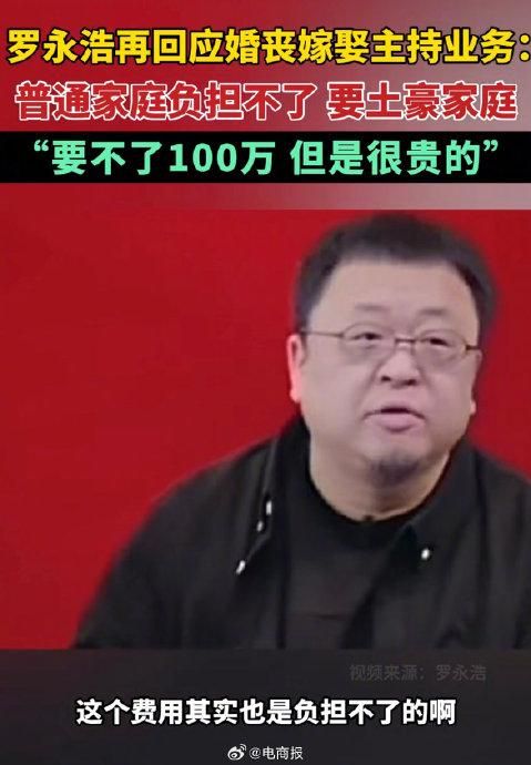 #罗永浩再回应婚丧嫁娶主持业务# 罗永浩谈婚丧嫁娶主持业务:普通家庭负担不了,要不了一百万,但很贵。