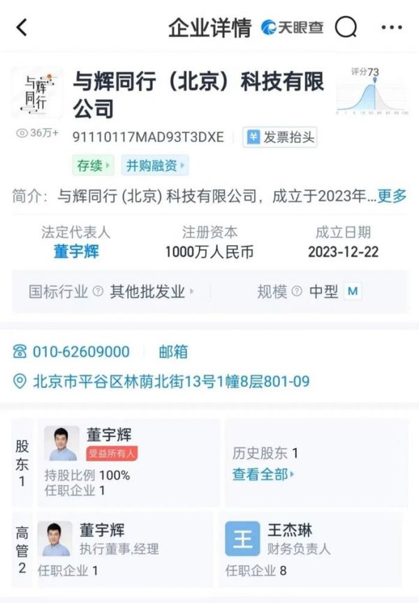 根据天眼查App显示,8月初,与辉同行的工商主体与辉同行(北京)科技有限公司发生工商变更,原全资股东北京新东方迅程网络科技有限公司退出,新增董宇辉为股东并全资持股。同时,俞敏洪卸任该公司监事。