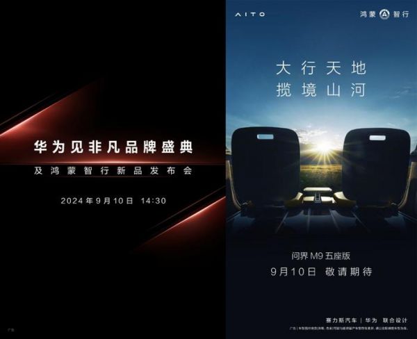 随后,@余承东 还发布了一张发布会上将亮相的新车的海报,并称,“鸿蒙智行的全景智慧旗舰SUV#问界M9# 五座版即将发布!大行天地,揽境山河,9月10日,更多细节将会揭晓,欢迎大家和我一起来揽境坐席上坐坐!”除此之外,虽然目前官方并未透露更多新品的名单,但结合此前消息,在此次发布会上有望推出华为三折叠屏手机新品以及正式公布与奇瑞合作的新车——智界R7的售价。