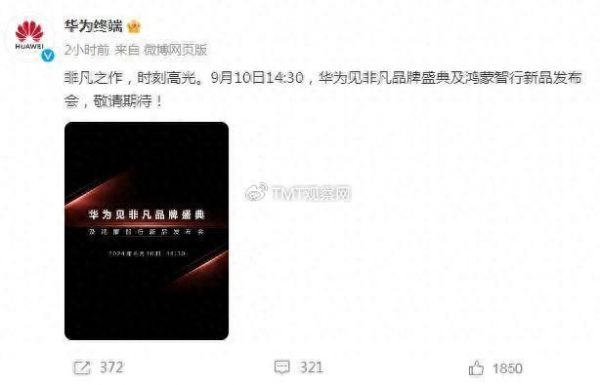 9月2日,华为终端在官微宣布,将于9月10日正式召开新品发布会。华为终端:“非凡之作,时刻高光。9月10日14:30,华为见非凡品牌盛典及鸿蒙智行新品发布会,敬请期待!”