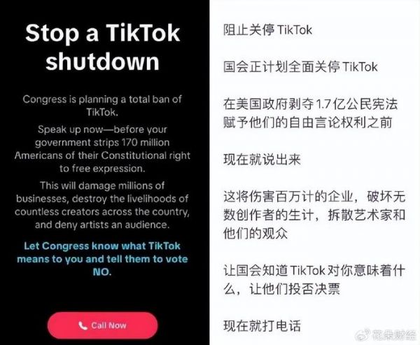 TikTok号召广大用户,“让国会知道TikTok对你意味着什么,让他们投否决票,现在就打电话。”