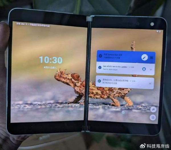 微软Surface Duo可是手机界的一朵奇葩,采用了两块5.6英寸1800x1360分辨率的屏幕,宽高比类似3:2标屏,所以展开后很大很宽。你说它是手机吧,这玩意一点便携性都没有,你说它是平板吧,展开后中间又一条“分界线”。此外虽然是微软出的,但系统却是死对头的安卓10,后来好像可以升到安卓12。