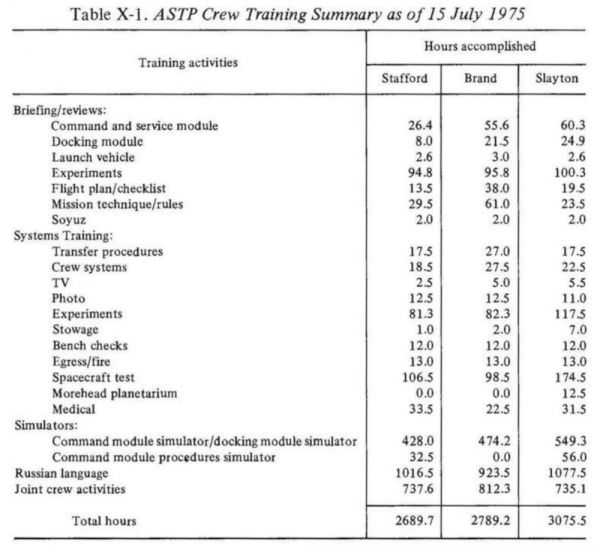 截至1975年7月15日的ASTP宇航员培训总结表格,图表截取自书籍“The Partnership:A History of the Apollo-Soyuz Test Project”