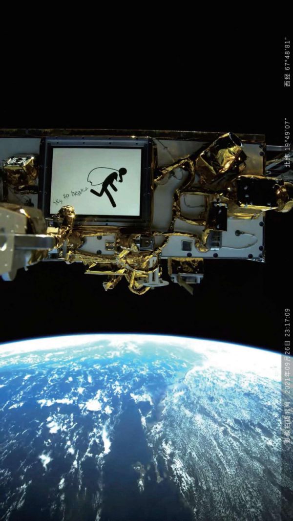 “瓢虫一号”卫星有一个面对星辰大海播放图像的屏幕,并配有一个自拍相机。这颗一天绕地球16圈的卫星,可以将动画静帧画面与包括地球在内的太空状态同框拍摄下来;一个背着包袱在太空中奔跑的“标准人”,当其处于不同国度上方时,从包袱中掉落的文字种类会随之改变,尝试与星下点轨迹经过的不同地域的语言互动。