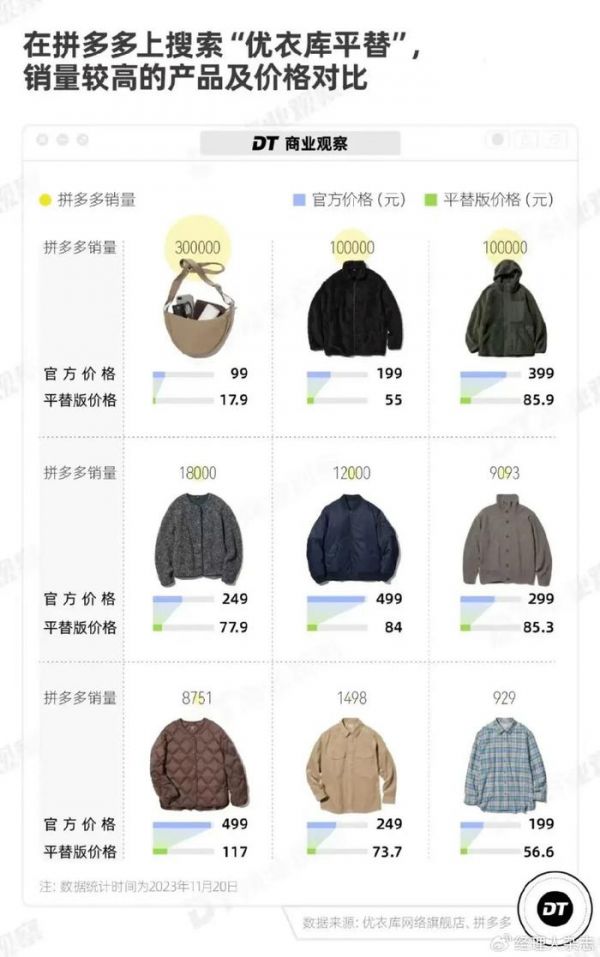 不久前,优衣库还被称为miumiu、lululemon等高端品牌的平替,谁曾想,现在它已经“被平替”了。《DT商业观察》统计发现,几乎所有优衣库的热门款都能在拼多多、1688上以不过百元的价格买到手。其中就有饺子包、摇粒绒拉链茄克、设计师合作系列摇粒绒连帽拼接外套等等。在小红书上,随处可见“优衣库平替品牌”的帖子。不少帖子还列出工厂名称,“是可以拿去优衣库退货的程度”,有篇就打着这样的标题。