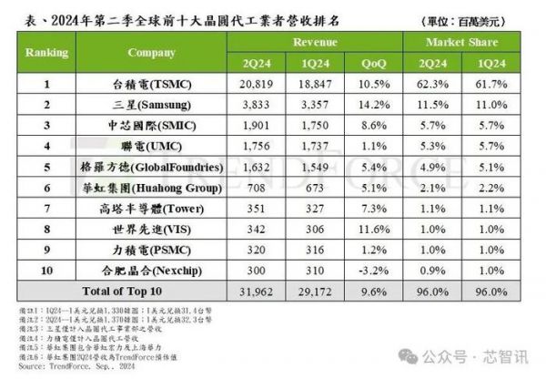 2024年二季度全球晶圆代工市场:中芯第三,华虹第六,晶合第十!