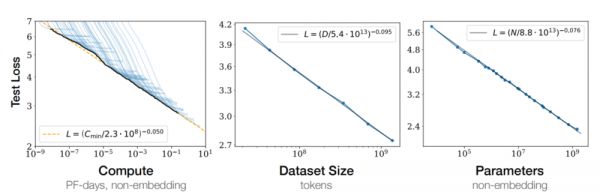 《神经语⾔模型的缩放定律》论文写道,随着模型⼤⼩、数据集⼤⼩和⽤于训练的计算量的增加,语⾔建模性能平稳提升 图片来源:OpenAI