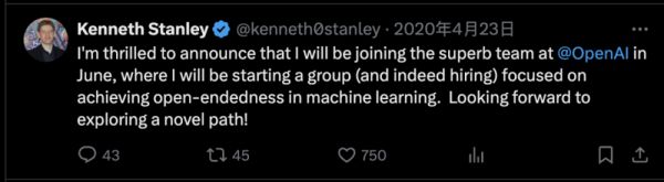 当然,我在OpenAI也不仅仅是因为Sam,内部很多人都有开放的想法。比如Jeff Clune(前OpenAI研究团队负责人),他在我们之前加入OpenAI。他也觉得,开放性探索是一个有趣且值得投资的领域。我们在那个时候达成了共识,所以我们被雇佣了。