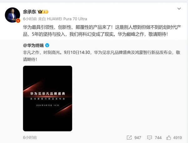 9月2日,华为终端在官微宣布,将于9月10日正式召开新品发布会。