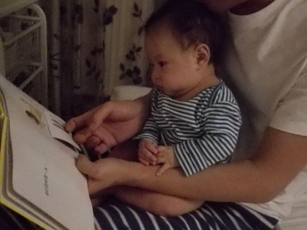 图 | 4个月的萌萌坐在爸爸怀里第一次看到书,妈妈拍下了照片