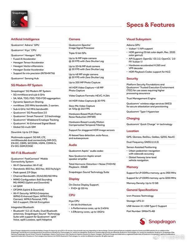 骁龙 6 Gen 3 还支持 LPDDR4x 和 LPDDR5 RAM,还有 UFS 3.1 存储。