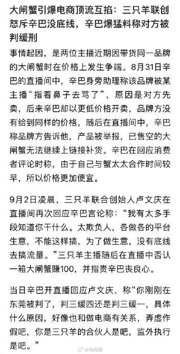 辛巴宣布近期不开播卖货,旗下渠道及主播今年也禁卖大闸蟹