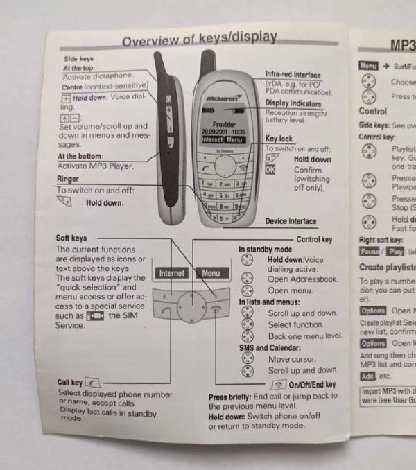 这机器还有一本专门重制的说明书,不仅介绍了基本功能,还介绍了底座和光碟的用途,看来原始包装中应该是定制了这两件东西。后来到了西门子SX1时代,我记得迈凯伦跑车也推出过黑色定制版,但存世量比西门子6688迈凯伦版要多,价值也没这么大。想想还是当年的手机有意思,哪怕一部黑白屏手机都能玩的不亦乐乎,如今智能手机功能虽然强大,但千篇一律太没劲了。
