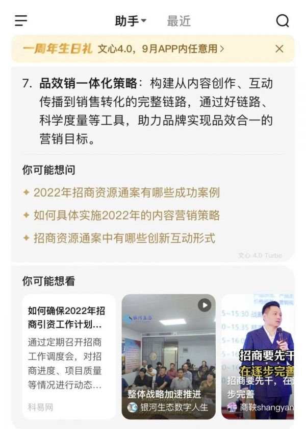 剁椒Spicy曾上传了一份招商方案进行测试。文小言在对方案内容核心整理提取的同时,猜测用户可能想了解方案的核心策略,并由此通过“你可能想看”的模块给出了三个用户可能想要进一步搜索的问题,从而引导用户与文小言产生多轮交互,直至解决问题。同时,也通过“你可能想看”给出若干相关网页或视频链接,融合了搜索结果反馈和推荐阅读的功能,而这或为商业化预留了位置。