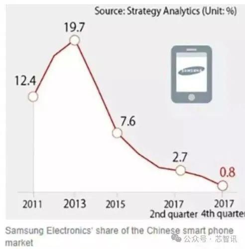根据strategy Analytics的数据显示,2013年三星在中国智能手机市场还有19.7%的市场份额,2015年就降至了7.6%,而在Note7事件之后,2017年四季度在中国智能手机市场的份额就已经降至了0.8%。