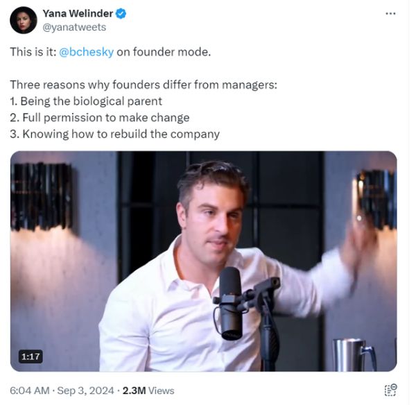 讲座之后,硅谷投资教父、YC联合创始人Paul Graham将Chesky的演讲写进了一篇博客文章,并提出了“创始人模式”的概念。他表示,相较于只通过下属掌控公司的职业经理人,亲力亲为的创始人更有利于公司的发展。