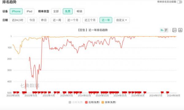 根据七麦数据显示,豆包App目前位列App Store应用(免费)总榜第2的位置。如果将时间线拉长到一年,从排名趋势可以看出,豆包的排名呈现上升趋势,今年6月开始,豆包App已经处在App Store应用总榜的第一梯队。