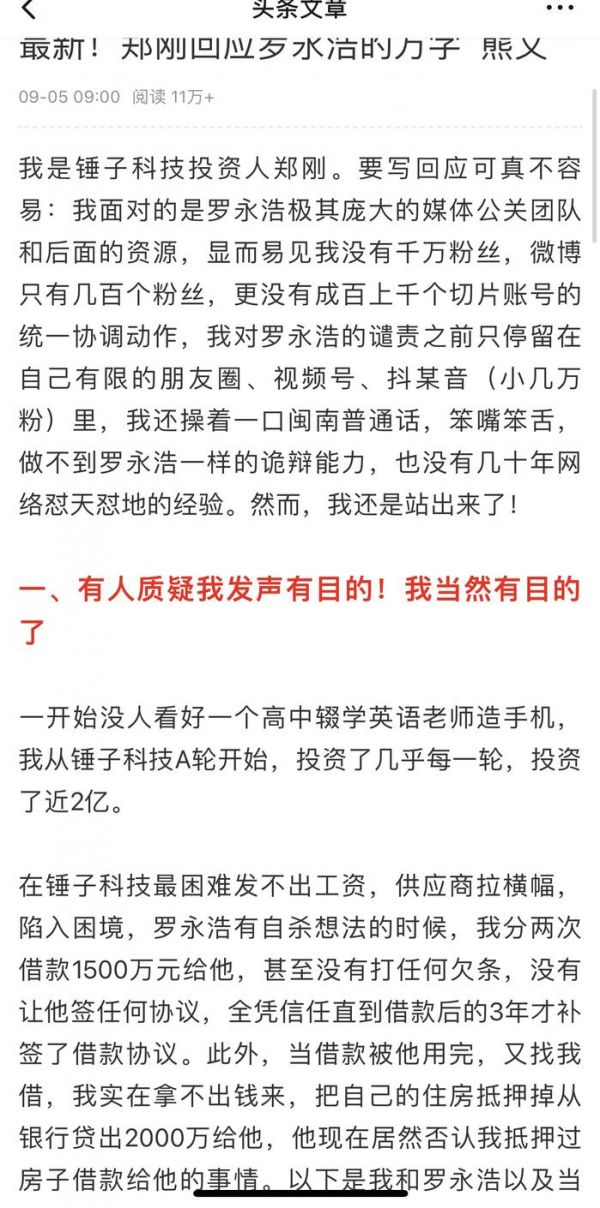 罗永浩回应郑刚最新千字长文:感激1500万借款,但别混淆视听