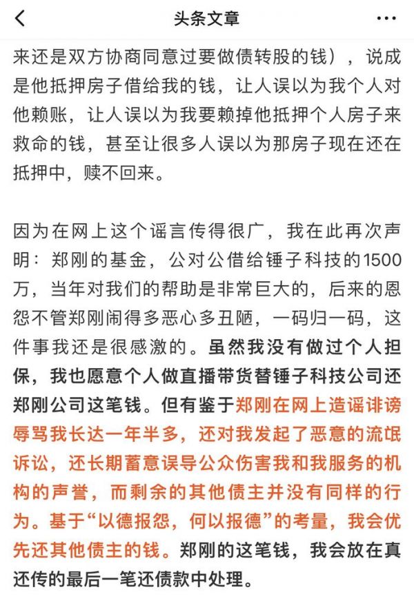 文中,罗永浩再次声明,对于郑刚基金,公对公借给锤子科技的1500万,当年对锤子的帮助非常巨大,这件事他很感激,也愿意个人做直播带货替锤子科技公司还郑刚公司这笔钱。但有鉴于郑刚在1年多的行为,罗永浩会优先还其他债主的钱。郑刚的这笔钱,会放在真还传的最后一笔还债款中处理。