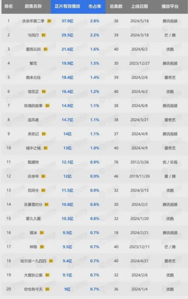 流走的还有腾讯视频出品的爆款电视剧《繁花》和《庆余年第二季》。