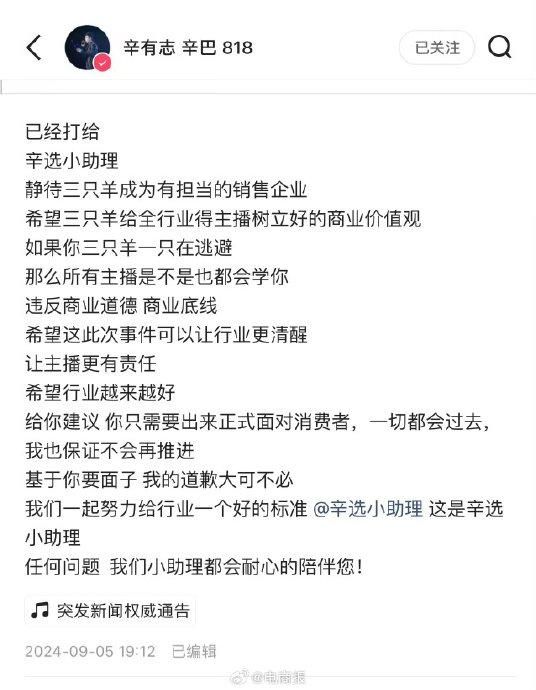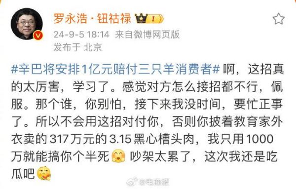 辛巴晒1亿元转账单,将安排赔付三只羊消费者,罗永浩直呼学到了