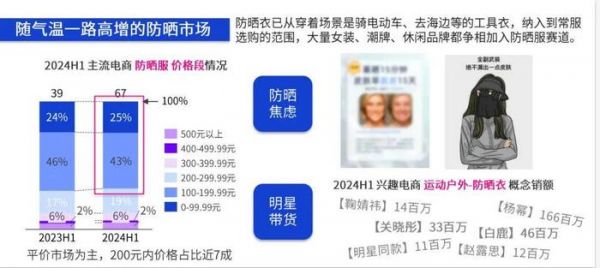 数据显示:对比去年同期,2024 H1主流电商平台运动户外、服饰鞋包增速20%,领跑电商。以防晒市场为例,随着气温一路走高,防晒市场也一路看涨。2024 H1,防晒服在兴趣电商和货架电商的销售额分别是27亿和40亿,对比去年同期增长18%。